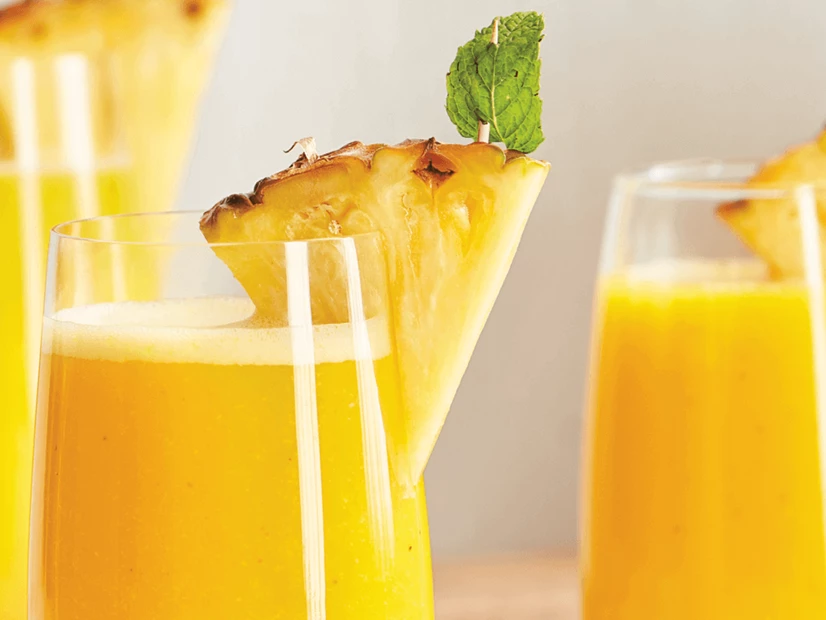 Num liquidificador, coloque as rodelas de abacaxi, o sumo de laranja, as bananas, a água e hortelã.