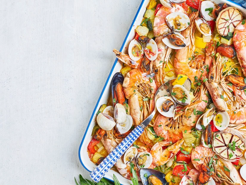 Coloque num tabuleiro o marisco, a mistura de cebola e pimento, os tomates cherry e a cabeça de alho cortada
