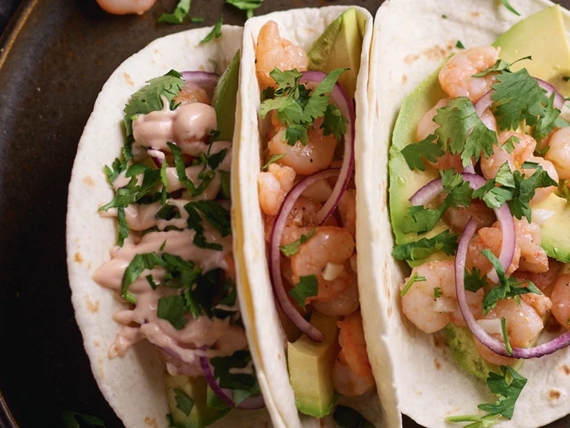 Monte os tacos, colocando no centro fatias de abacate, cebola e camarões.