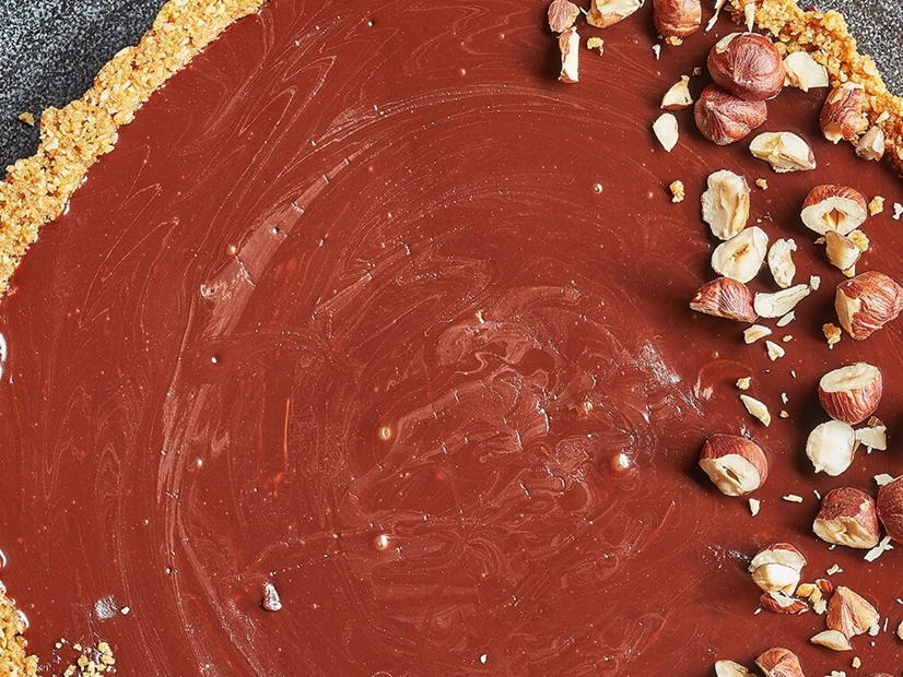 Cubra a base da tarte com o creme de chocolate e decore com as avelãs, umas inteiras e outras partidas