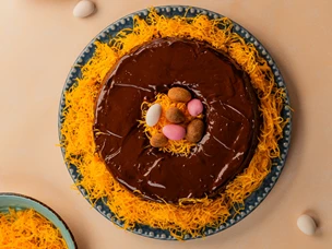 Para a cobertura, aquecer as natas até começarem a fervilhar e colocar por cima o chocolate partido em pedaços pequenos. Deixar repousar durante 5 minutos.