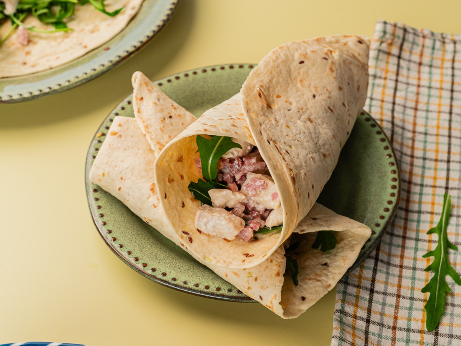 Recheie os wraps com a rúcula e o preparado anterior. Enrole os wraps e feche com um palito.
