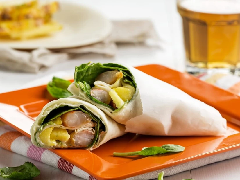 Estenda os wraps numa superfície plana. Coloque 2 c. sopa do recheio em cada wrap.