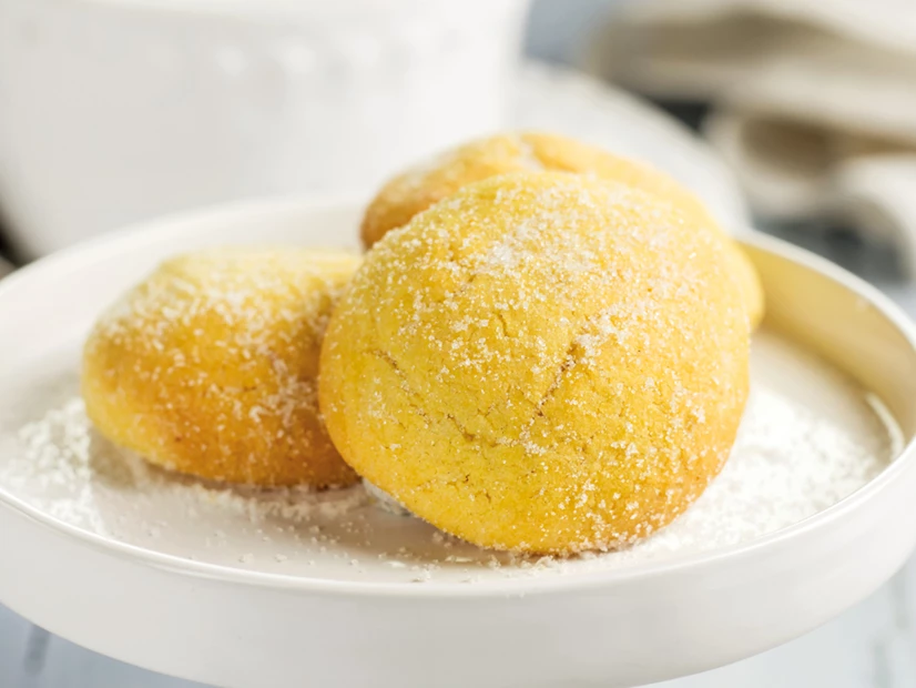 Retire a massa do copo e forme pequenas bolas (cerca de 20 g cada uma). Disponha‑as sobre um tabuleiro de forno forrado com papel vegetal e achate‑as ligeiramente (com a ajuda de um garfo).