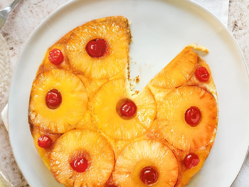 Retire do forno, deixe arrefecer (cerca de 10 minutos) e desenforme com cuidado, de modo que o ananás e a calda fiquem por cima.