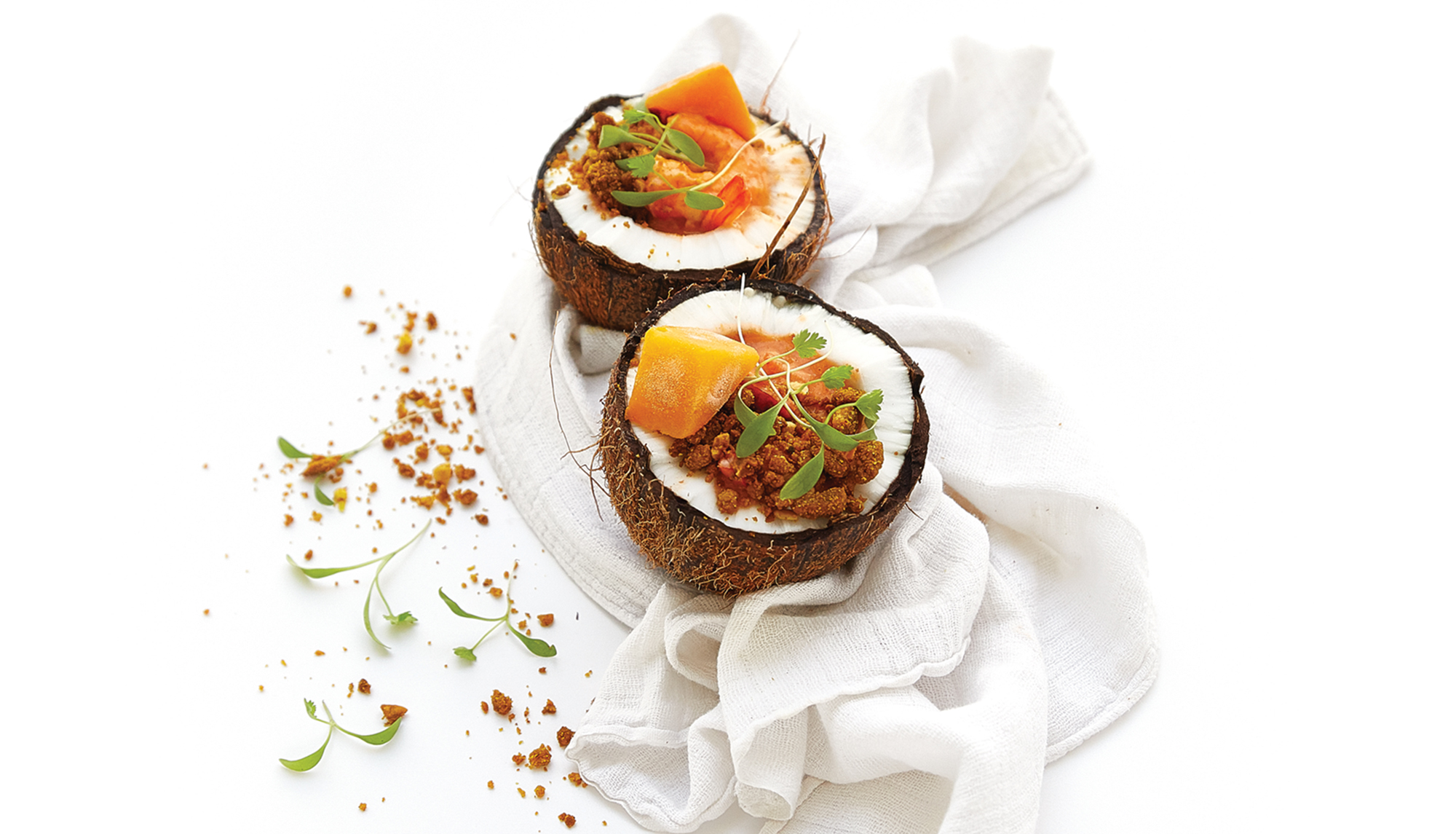 Junte os camarões e programe 5 minutos , a 100ºC com a Rotação Inversa na velocidade 2. Sirva bem quente com o crumble de caril sobre o camarão e termine com cubos de manga fresca. Num jantar mais festivo, experimente servir este prato delicioso em cocos abertos. Irá impressionar paladares e não só!