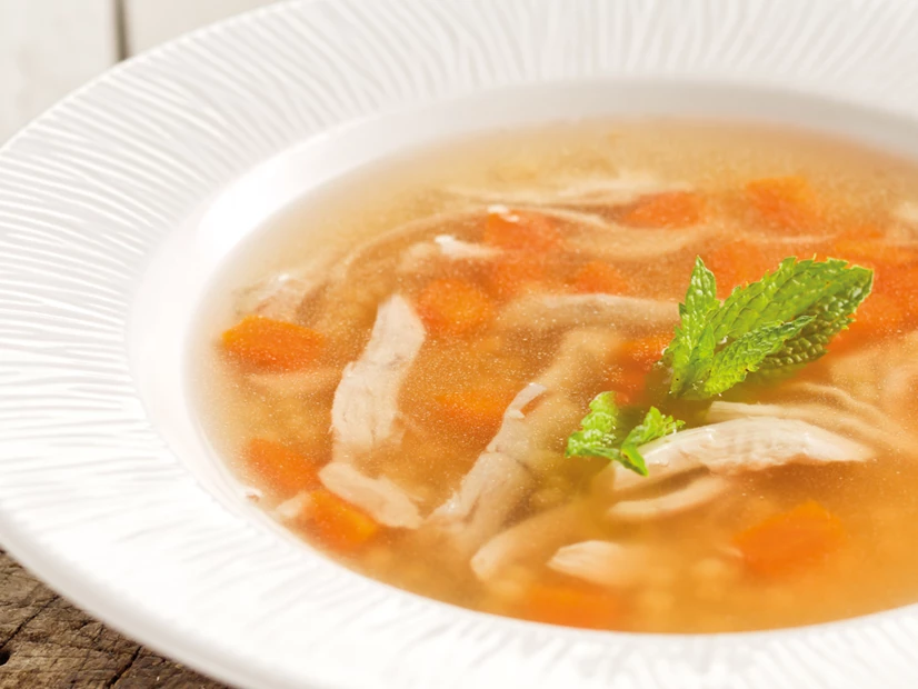 Desfie o frango, eliminando a pele e os ossos, e corte a cenoura em cubos. Quando o tempo terminar, junte‑os à canja.