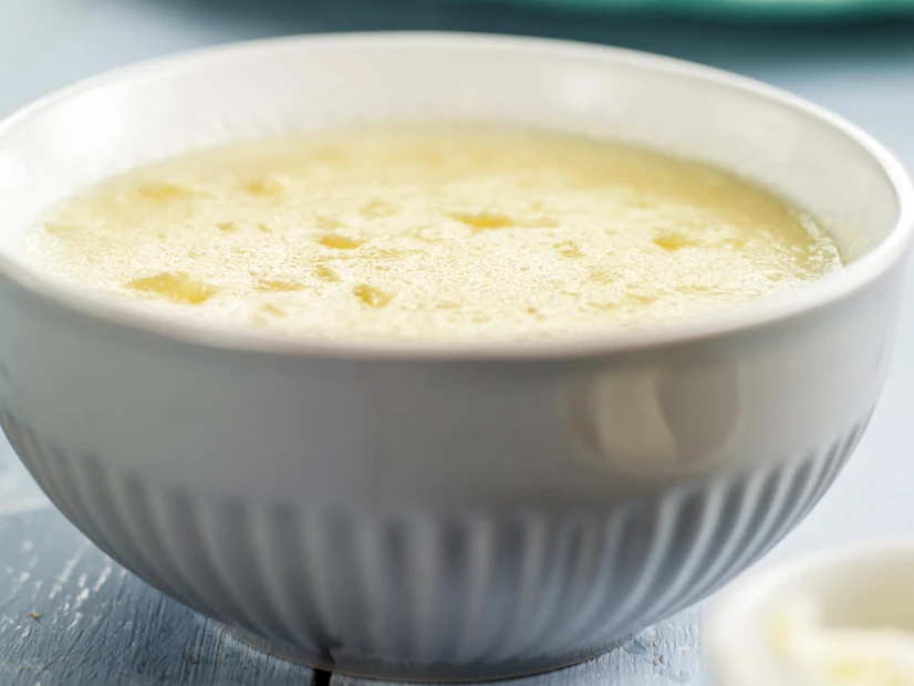 De seguida, regule 1 minuto na velocidade 3 e, durante o funcionamento da máquina, verta a calda de açúcar (já fria), em fio, através da abertura da tampa. Certifique-se que a mistura fica homogénea. Se necessário, baixe com a espátula a manteiga acumulada nas paredes do copo e programe mais alguns segundos à mesma velocidade e temperatura.