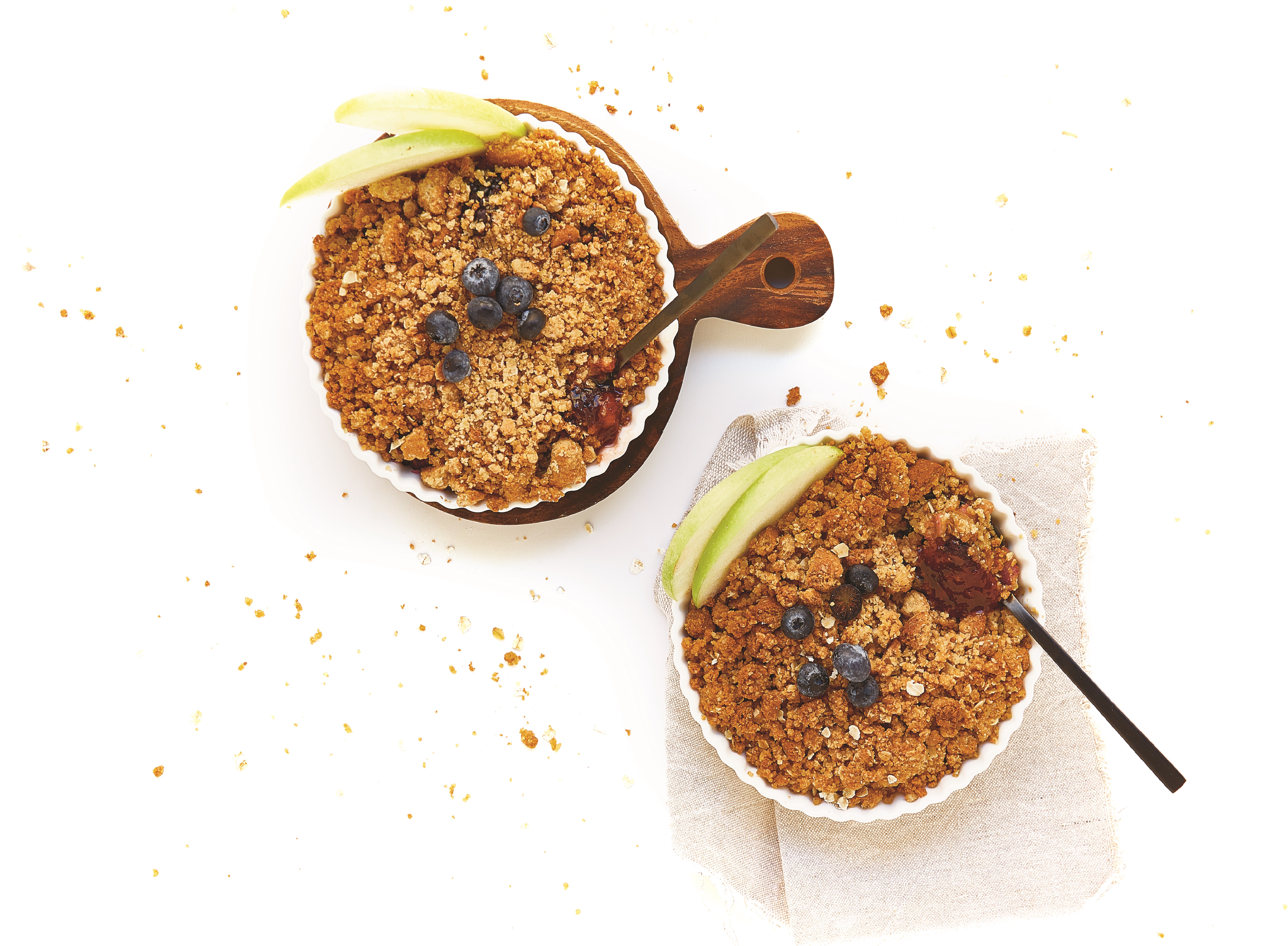 Lave bem a maçã e corte em pequenos cubos. Coloque em duas tacinhas, cubra com os mirtilos e termine com o crumble.