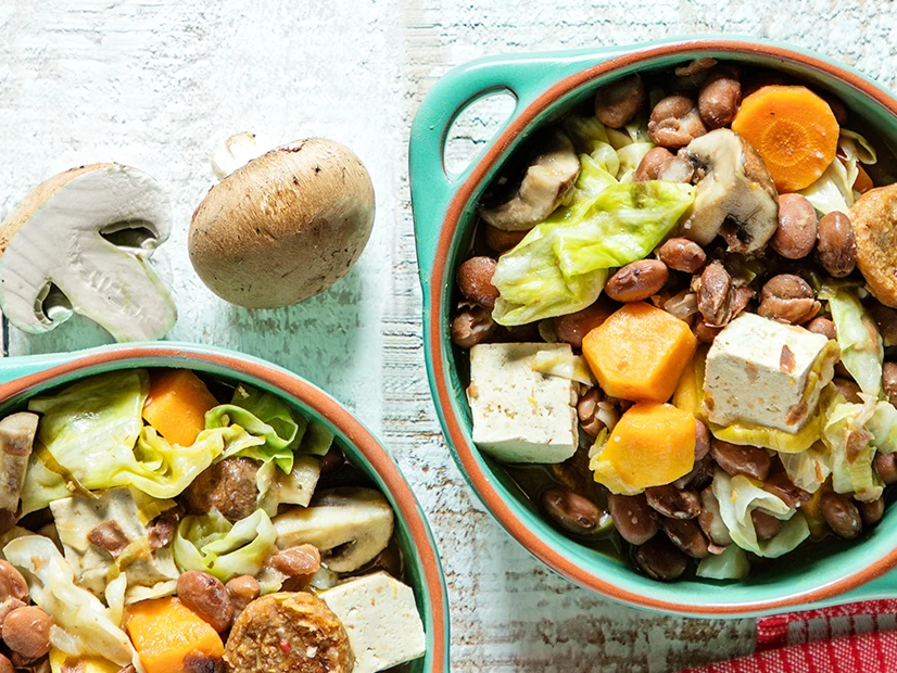 No final do tempo programado, retire a bandeja e acrescente no copo a abóbora cortada em cubos (2,5 x 2,5 cm) e os cogumelos cortados em 4 ou 6 partes (se forem grandes). Envolva com a espátula, recoloque a bandeja sobre o copo e coza mais 8 minutos na Função Vapor com a velocidade 1 e a Rotação Inversa. Retire a bandeja de vapor e mantenha-a com a tampa fechada.
