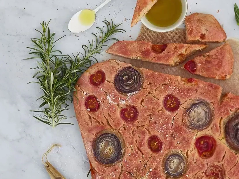 Regue com o restante azeite e pique a massa com as pontas dos dedos até ao fundo da forma. Decore com o alecrim, o tomate cereja cortado a meio e as rodelas de cebola roxa. Polvilhe com o sal e o alecrim e leve ao forno pré-aquecido a 225 ºC durante 30 minutos.
