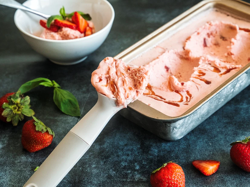 Sirva o gelado com morango fatiado e decore com folhas de manjericão.