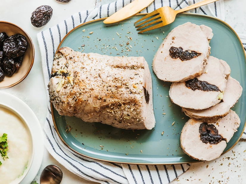 Corte o lombo de porco na longitudinal sem o separar por completo. Temperar com sal, pimenta e coloque as ameixas sobre o corte. Feche o lombo com a ajuda de um cordel de cozinha, tempere com o alho picado e tominho. Disponha-o na bandeja de vapor e reserve.