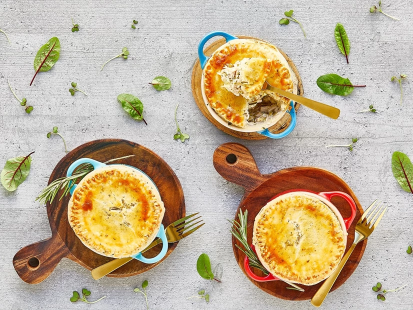 Distribua a carne em pequenas taças ou formas. Corte porções de massa com o diâmetro da taça e cubra a carne com a massa. Pincele com o ovo batido e leve ao forno durante 45 minutos a 1 hora.