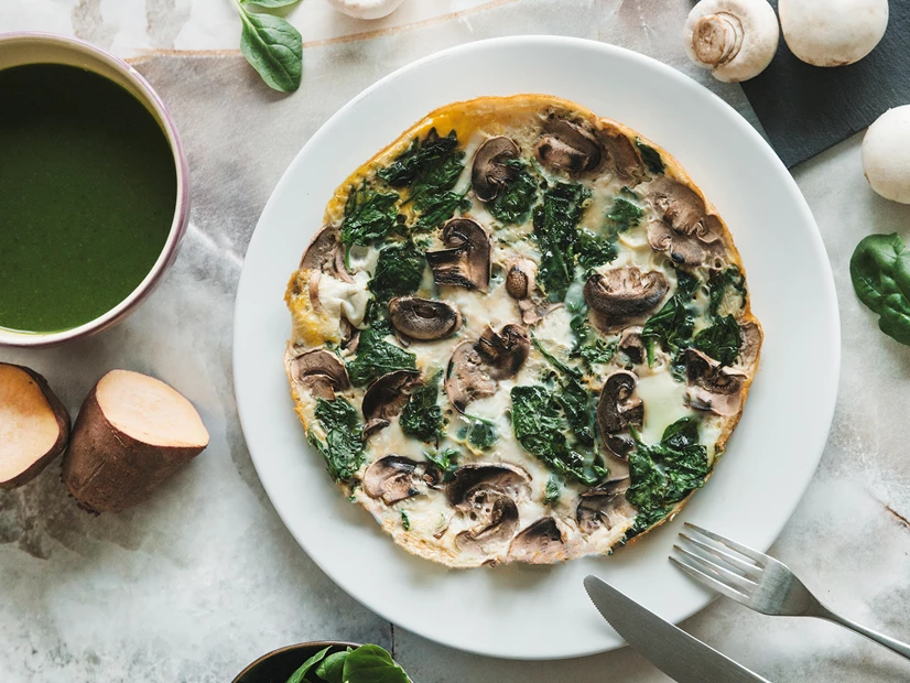 Prepare a omelete: Numa taça, bata levemente as claras com um garfo (só para ficarem misturadas). Junte a mistura de cogumelos e espinafres reservada (já sem líquido). Tempere com sal e pimenta a gosto. Reserve.