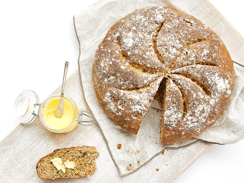 Sem retirar o pão do tabuleiro e tocando-lhe o menos possível, faça alguns cortes na superfície. Borrife levemente a superfície do pão com água (vai ajudar a obter um crosta mais crocante) e leve ao forno durante 30 a 40 minutos.