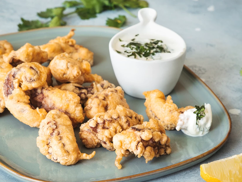 Sirva as pataniscas de polvo com o molho de iogurte e coentros.