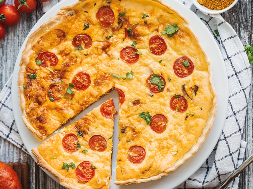Corte o tomate-cereja ao meio. Disponha-o (com a parte cortada virada para cima) na superfície da quiche.