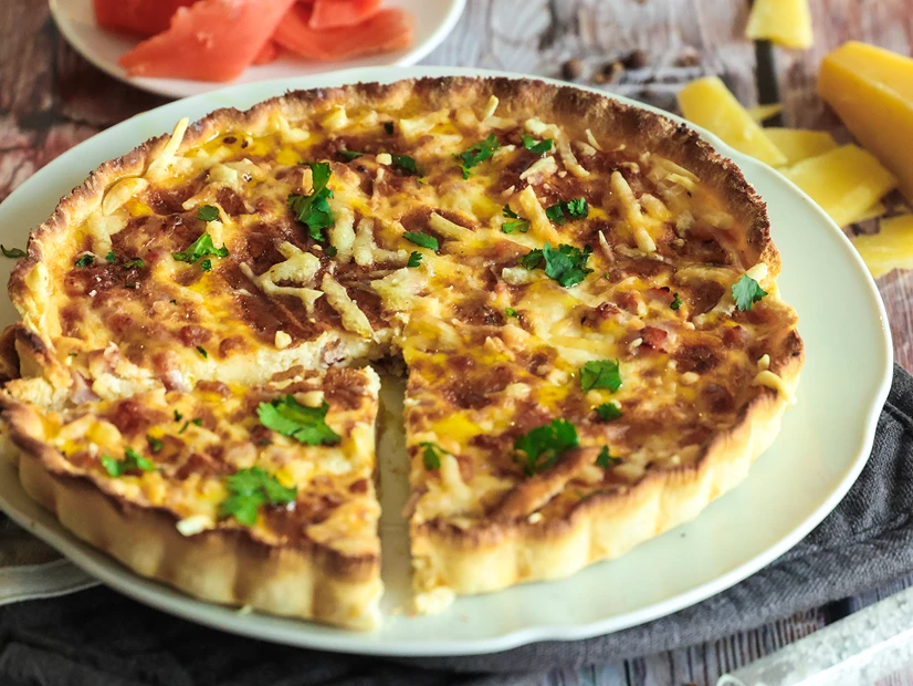 Verta a mistura sobre os ingredientes na forma da quiche e leve ao forno cercado 25-30 minutos, ou até que o recheio esteja firme e levemente dourado.