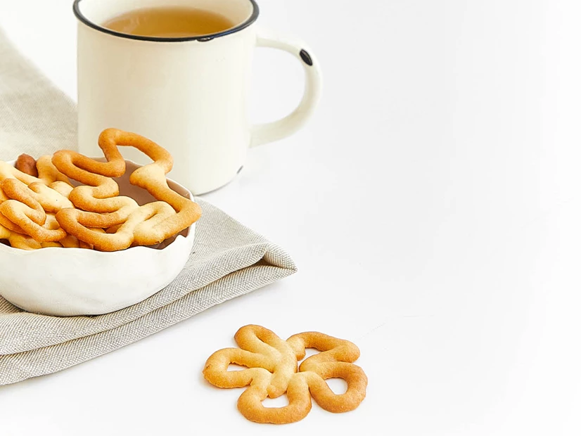 Transfira a massa para uma superfície enfarinhada e com as mãos molde rolinhos muito finos. Sobre um tabuleiro forrado com papel vegetal, desenhe com os rolinhos biscoitos de forma irregular, arredondados.