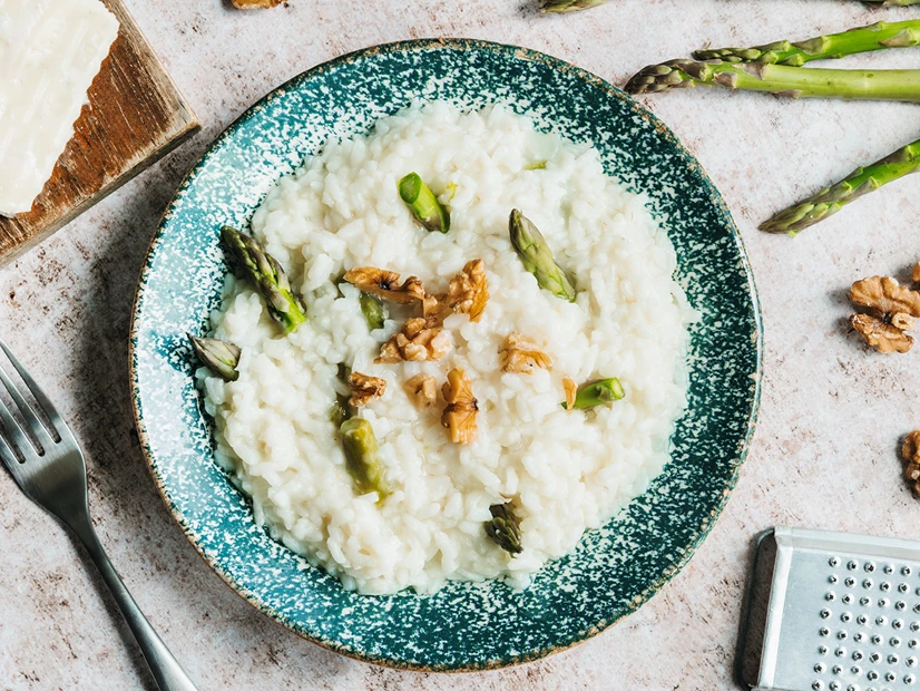 Coloque o misturador sobre a lâmina. Adicione o vinho, o arroz, o caldo de legumes, sal a gosto e os espargos reservados, e programe 15 minutos a 100°C na velocidade 1 com a Rotação inversa.