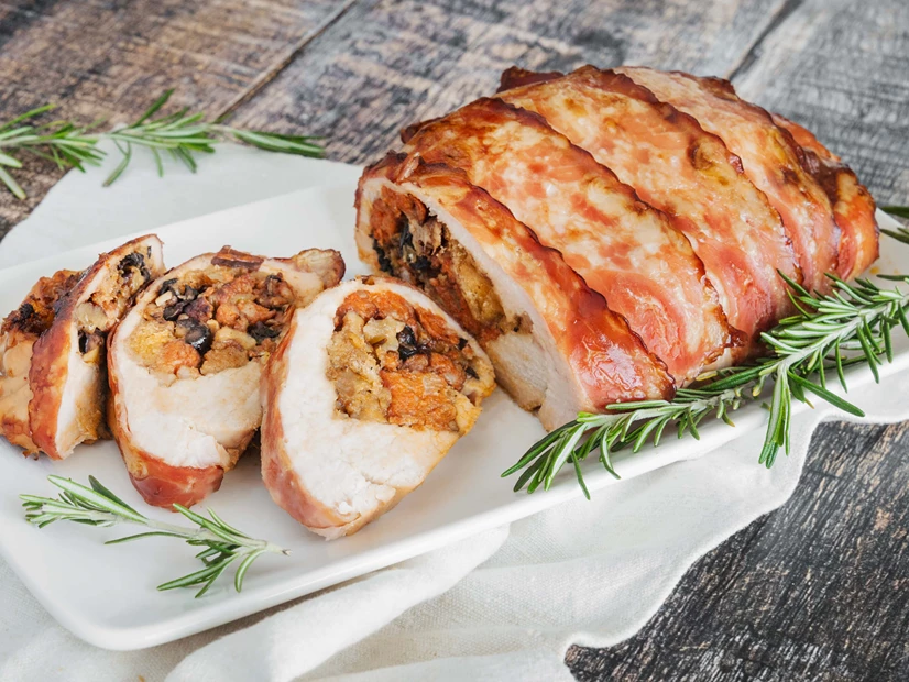Recheie o perú com este preparado, enrole e cubra o rolo com as fatias de bacon. Transfira-o para uma assadeira, regue com o azeite, vinho branco e alecrim (se tiver dificuldade em manter o rolo fechado, pode atá-lo com um cordel).