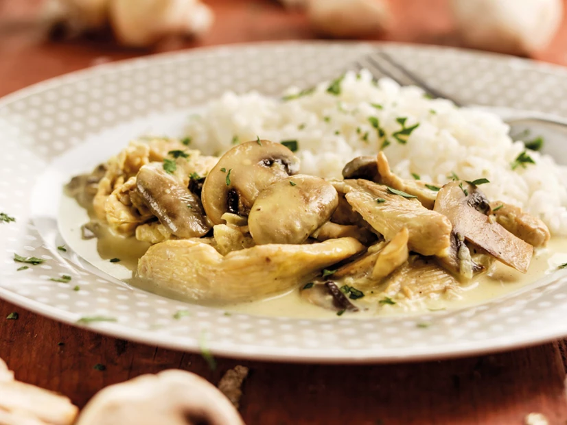 Incorpore as natas e a mostarda, retifique os temperos e programe 6 minutos, 100 °C, Rotação Inversa na velocidade 2. Verifique se o frango ficou bem cozinhado. Se necessário, programe mais 1‑2 minutos na mesma velocidade e temperatura.