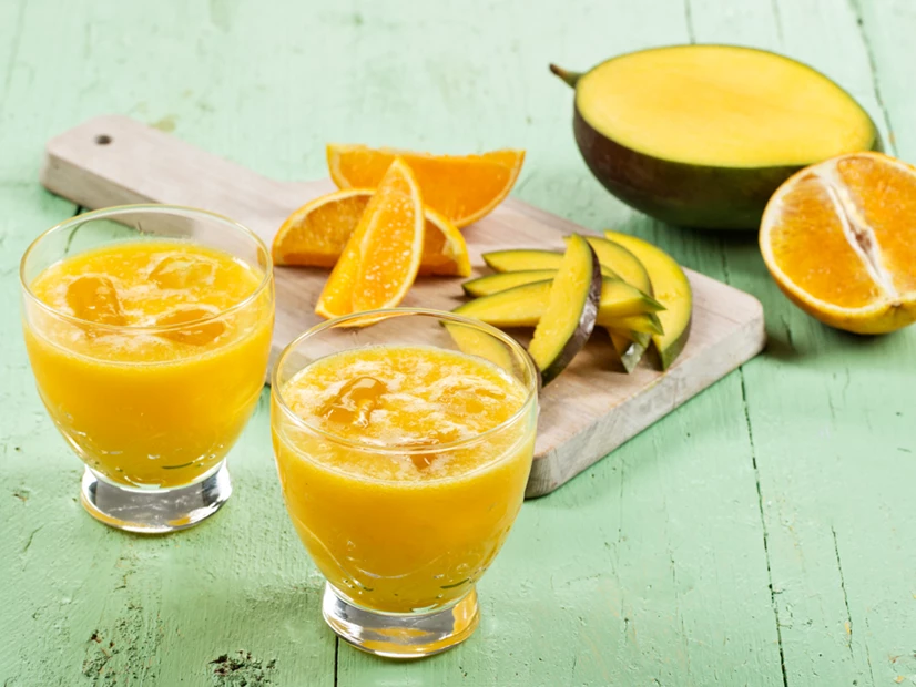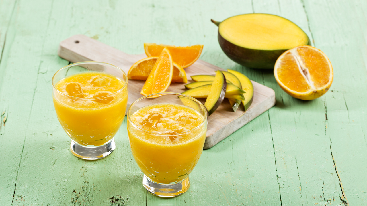 Descasque e retire o caroço à manga e corte-a aos pedaços. Coloque-a no copo.