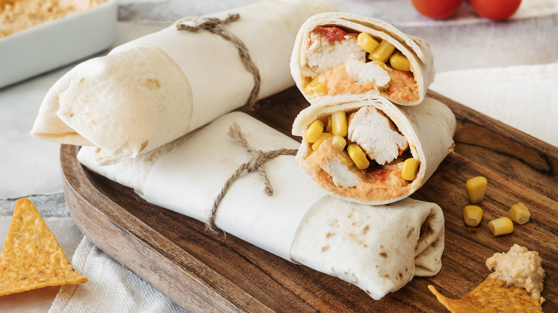 Prepare os wraps: Barre as tortilhas com húmus de pimento (se preferir, pode aquecê-las previamente numa frigideira). Divida o preparado de frango pelas 8 tortilhas e polvilhe com coentros picados a gosto. Enrole, dobre a(s) ponta(s) e sirva.