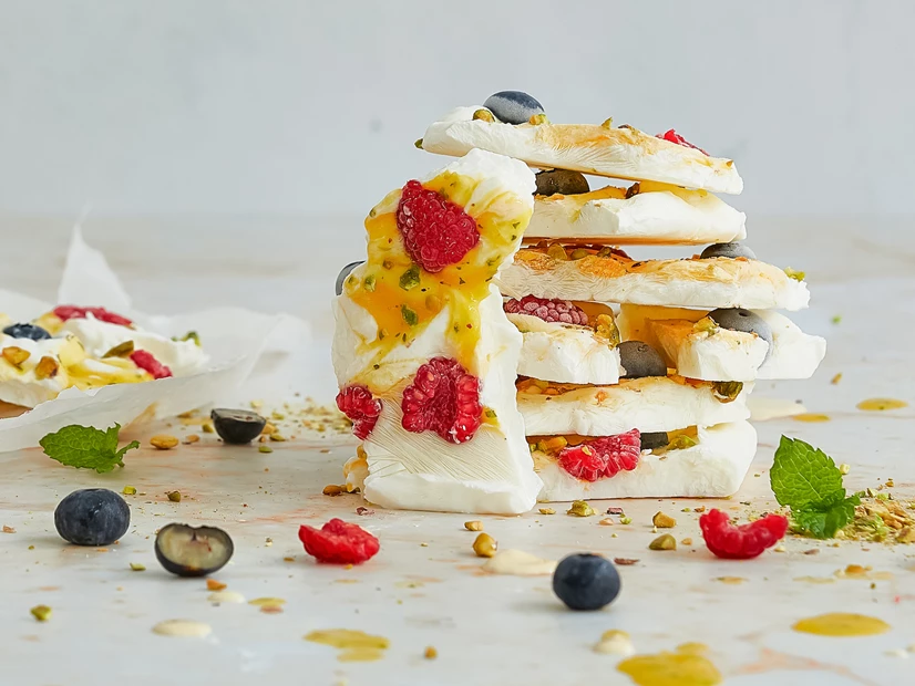 Coloque por cima os frutos vermelhos a gosto e polvilhe com os pistácios triturados.